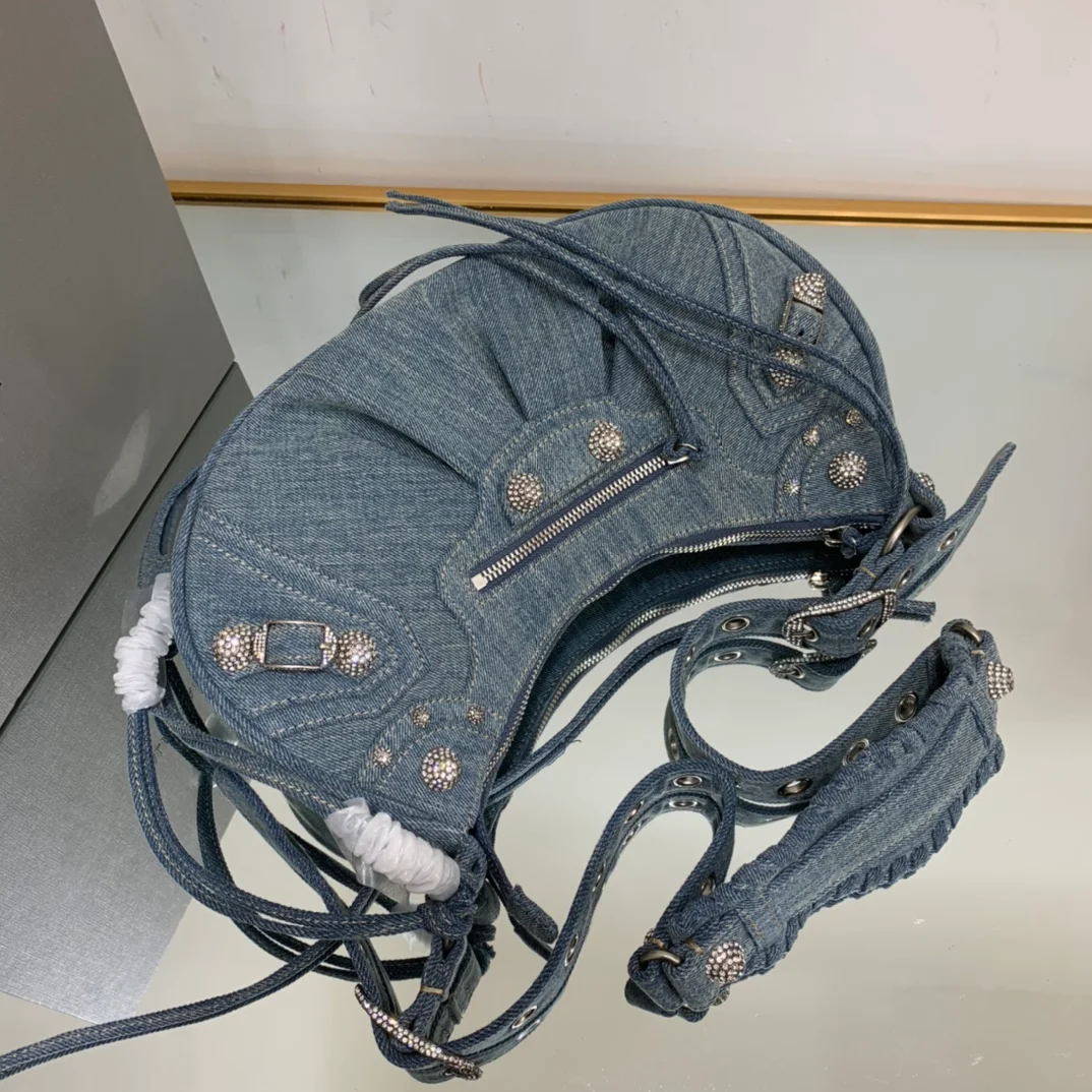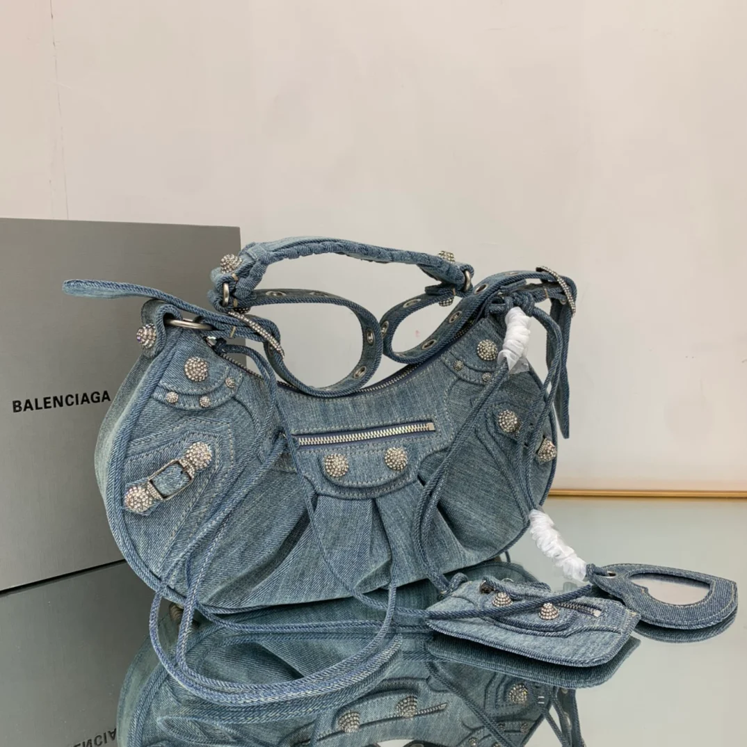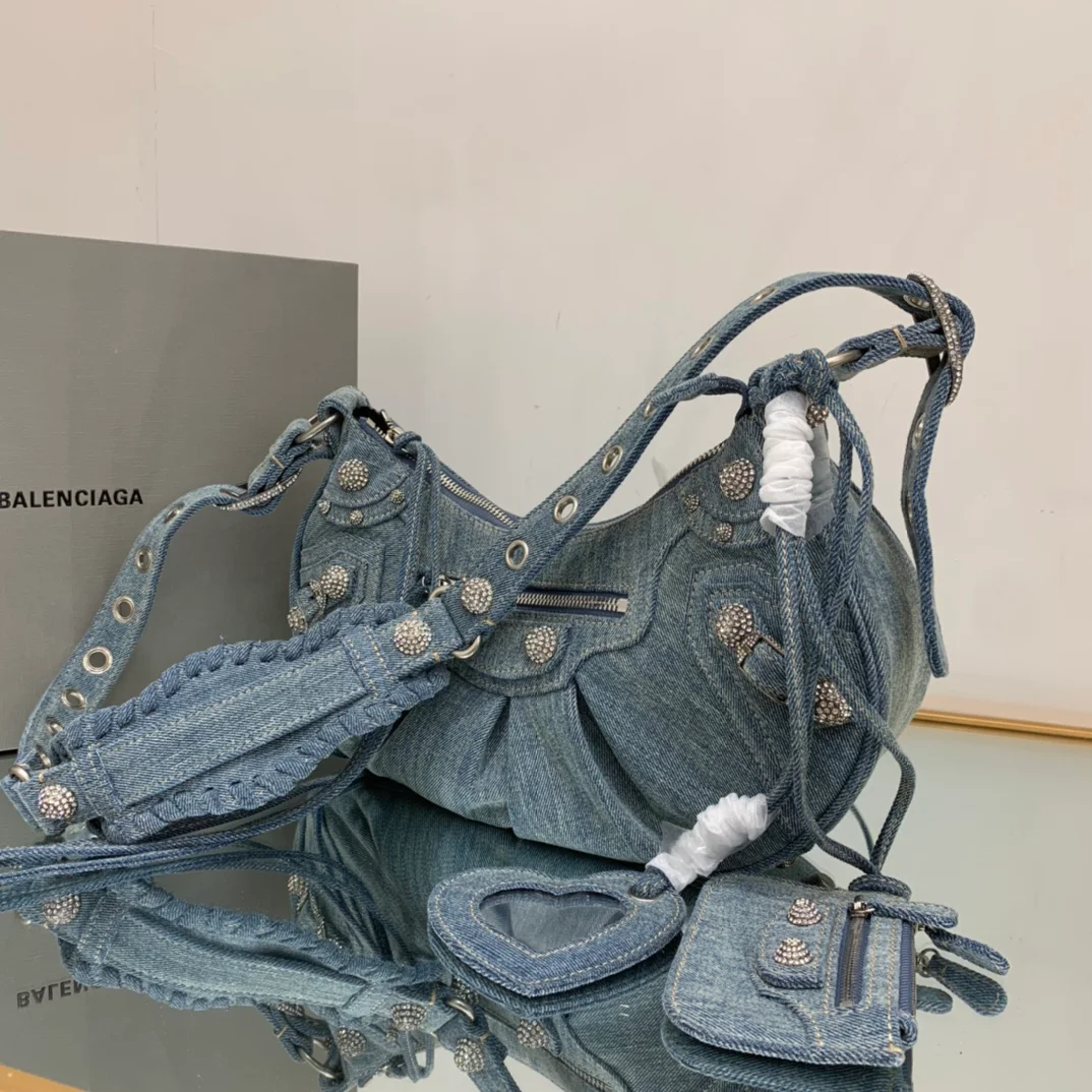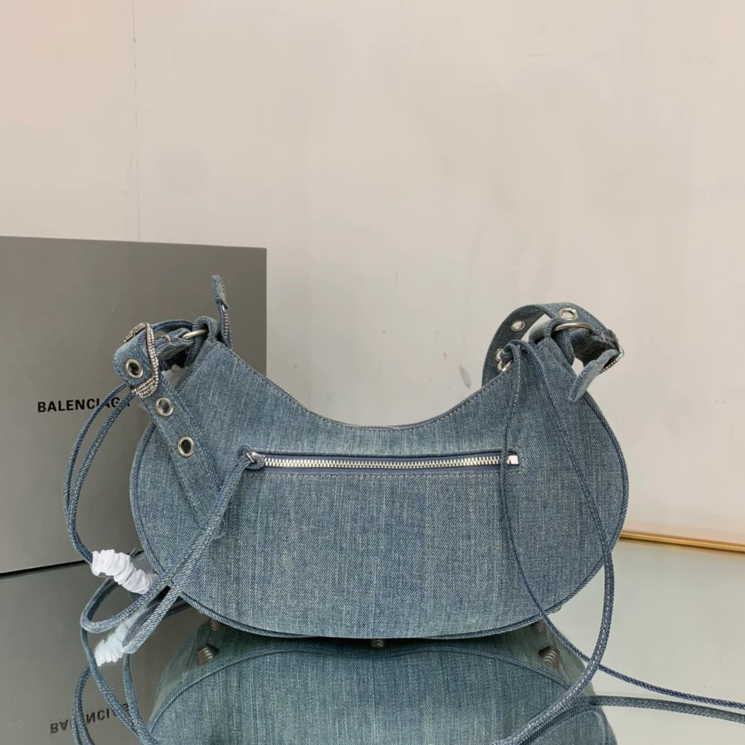 Balenciag Le Cagole Crescent Moon Shoulder Bag/Crossbody Bag – A tribute to the classic motorcycle bag series! A stunning new addition! This improved version of the traditional motorcycle bag features an adjustable woven shoulder strap with eyelets, an external leather card holder, and a heart-shaped hanging mirror!