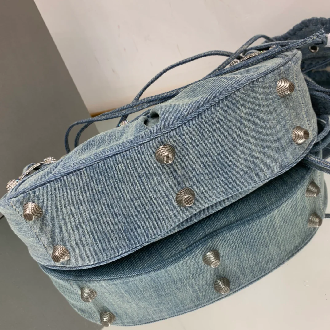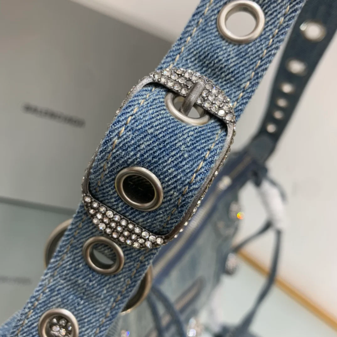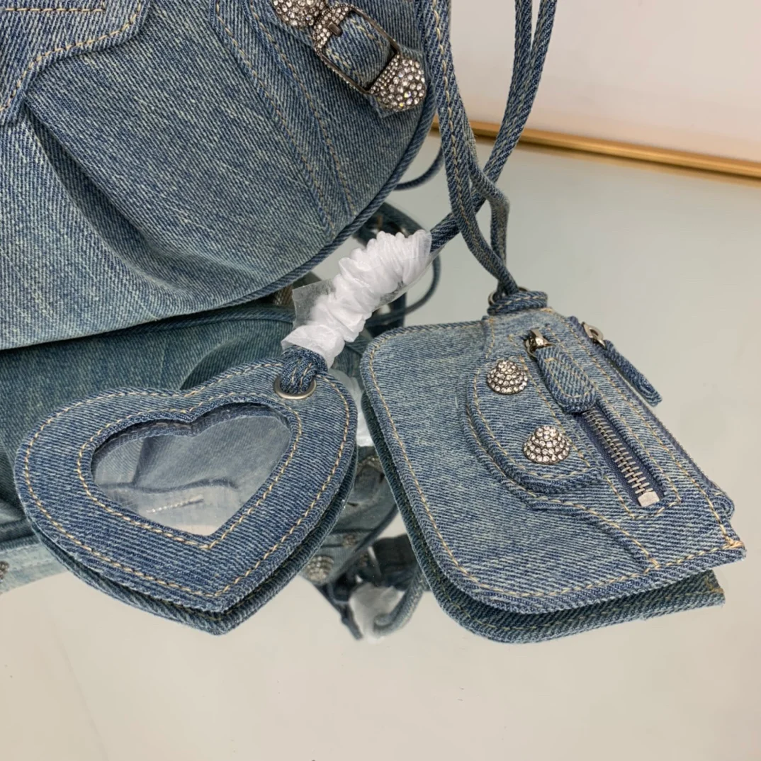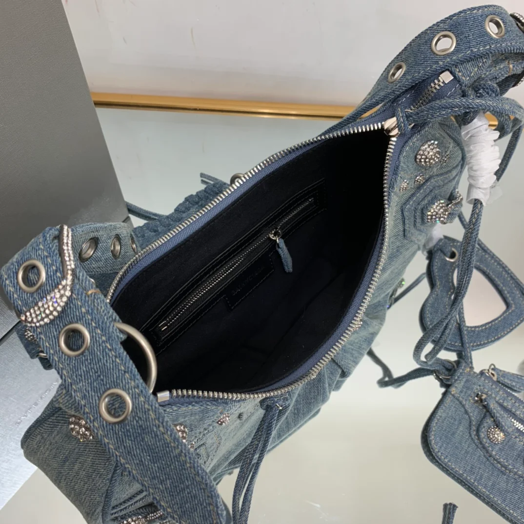 Balenciag Le Cagole Crescent Moon Shoulder Bag/Crossbody Bag – A tribute to the classic motorcycle bag series! A stunning new addition! This improved version of the traditional motorcycle bag features an adjustable woven shoulder strap with eyelets, an external leather card holder, and a heart-shaped hanging mirror!