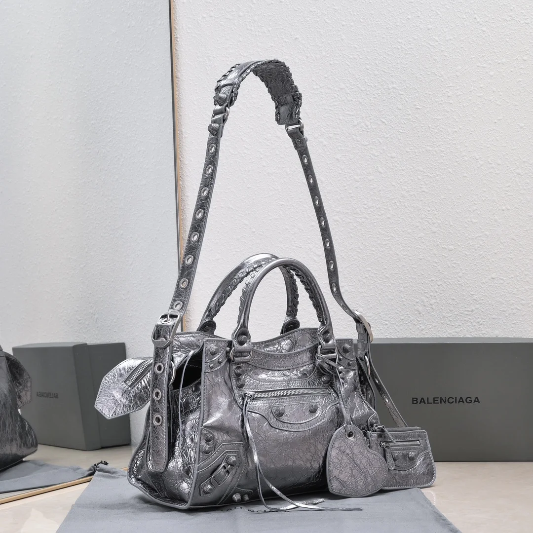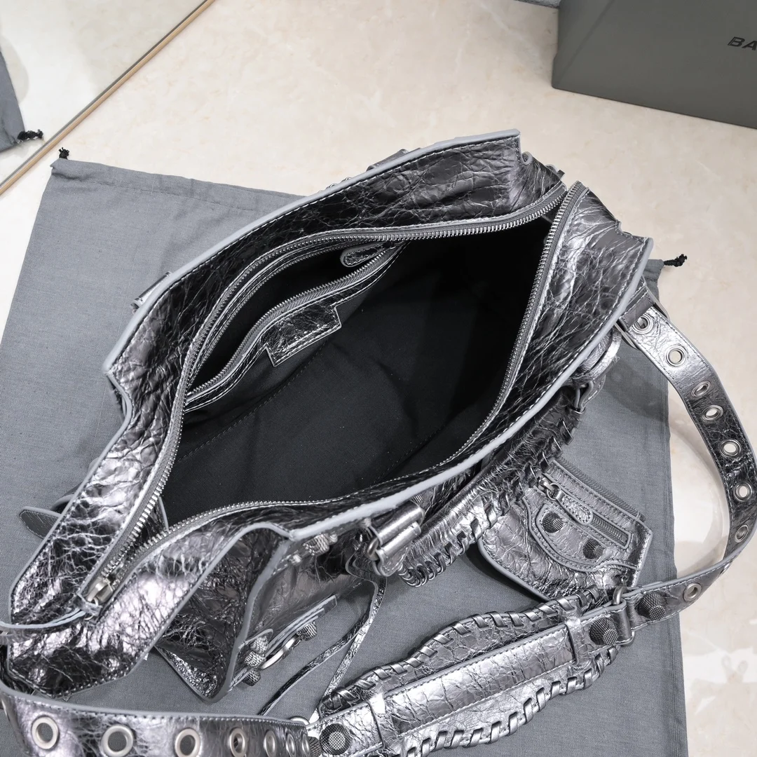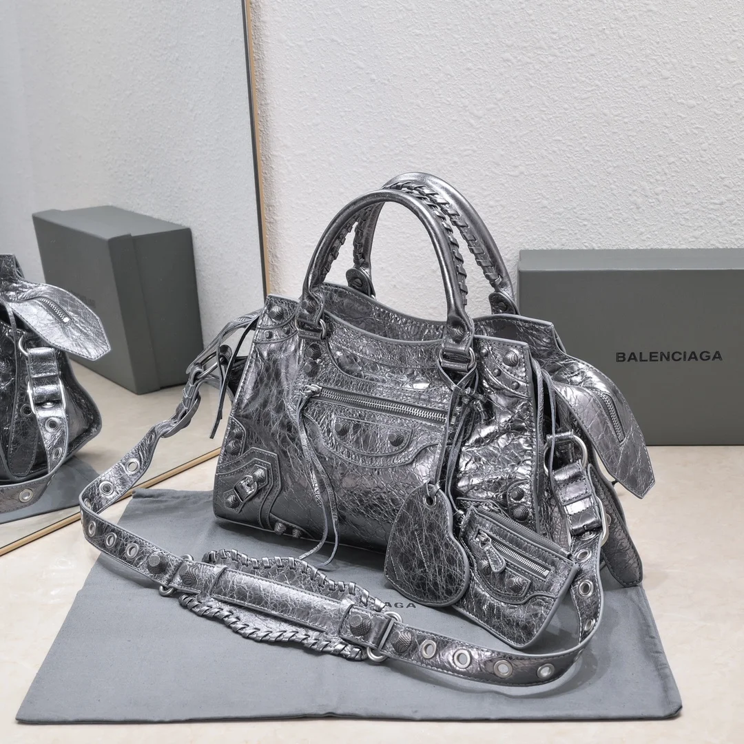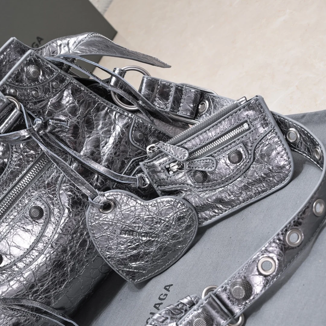 Balenciaga 🆕NEO CAGOLE Motorcycle Trapezoidal Size S Original Imported Crackled Sheepskin Vintage Distressed Silver Hardware Paired with ❤️Heart-shaped Mirror🪞 +