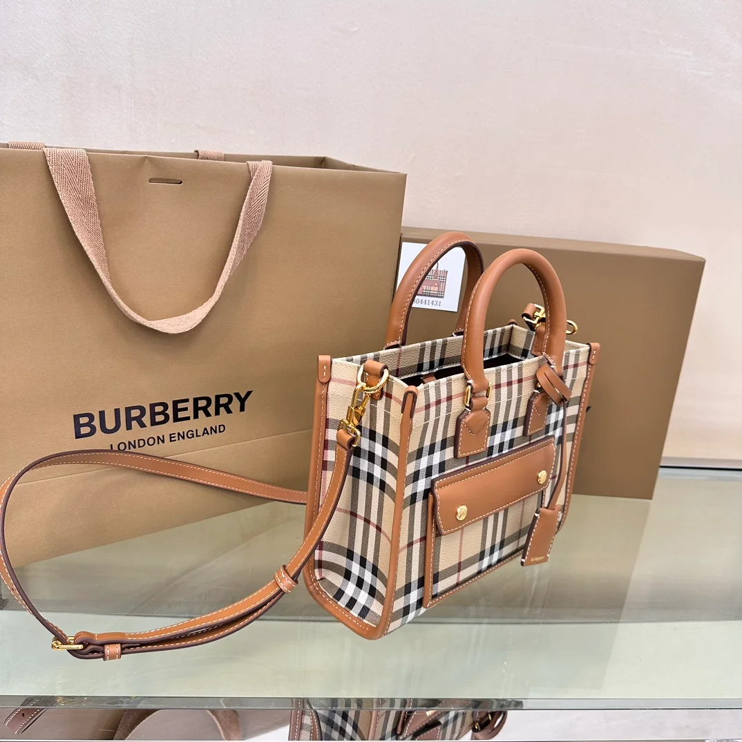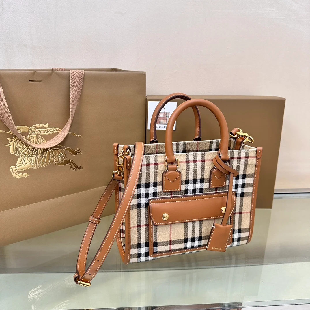 Burberry's latest mini brown check Freya tote bag💕💕 features a refined design and is crafted from checkered and top-stitched leather. It can be carried by the top handle or the adjustable crossbody strap. 23 x 8 x 19cm🌟