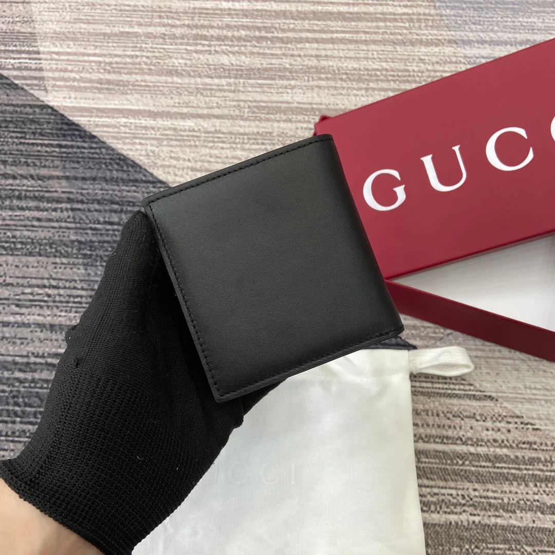 Gucci -【Comes with full boutique packaging】‼️ The GG Emblem collection reinterprets the classic pattern with creative design and innovative functionality, crafting a timeless collector's item for years to come. This bi-fold wallet is crafted from black smooth calfskin leather, with the interior subtly incorporating a new GG monogram fabric pattern, offering a fresh take on the accessories collection. The front features a delicate Gucci embossed design, and the interior boasts multiple compartments.