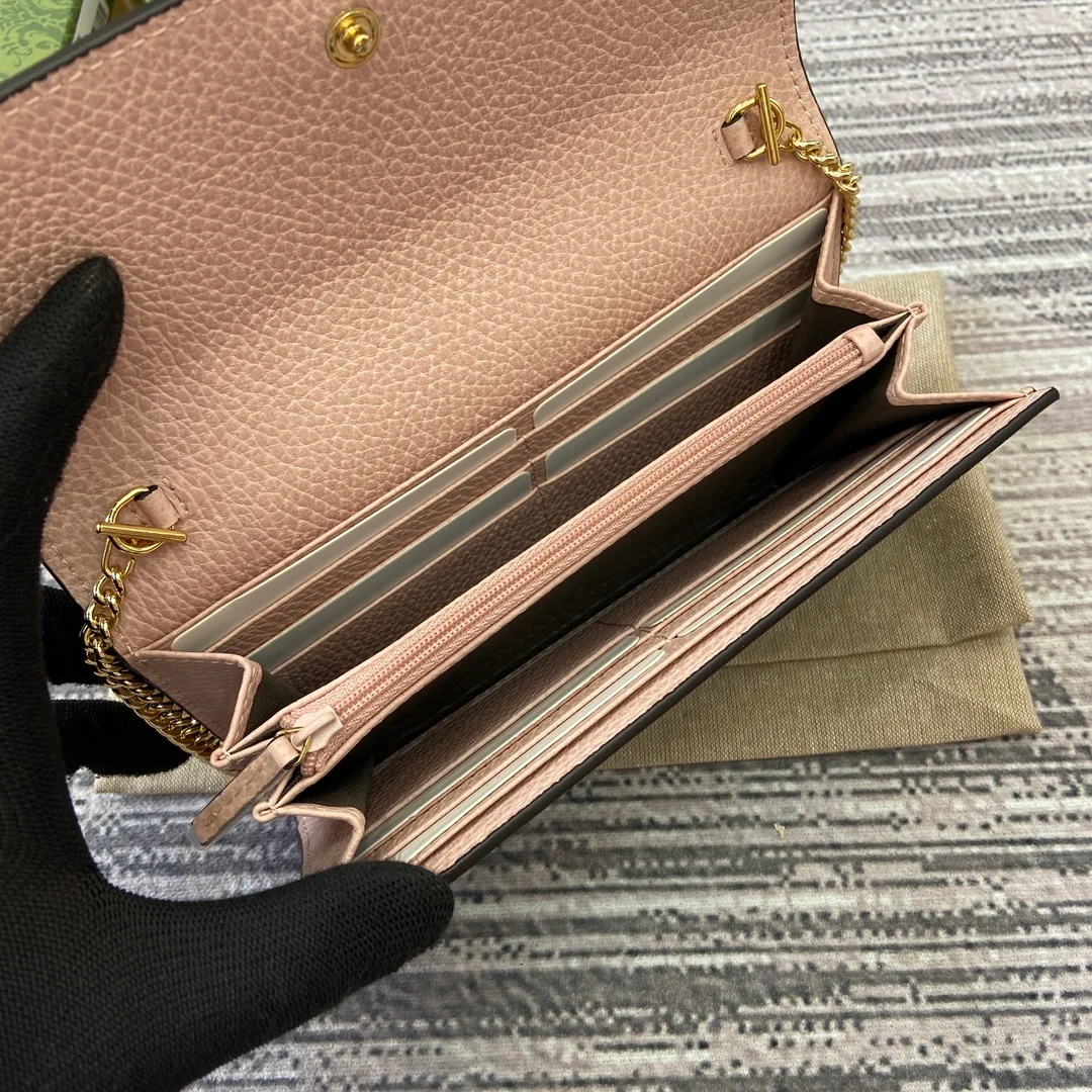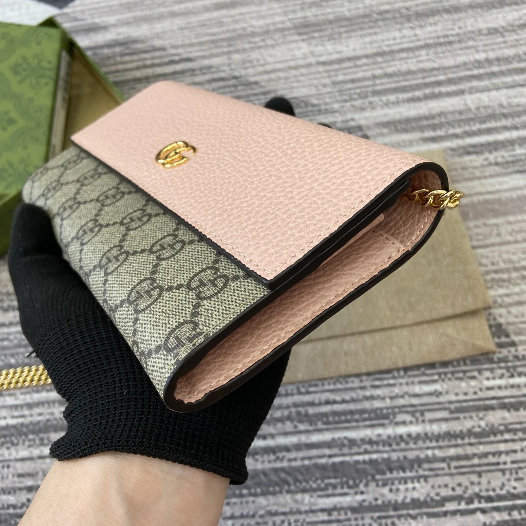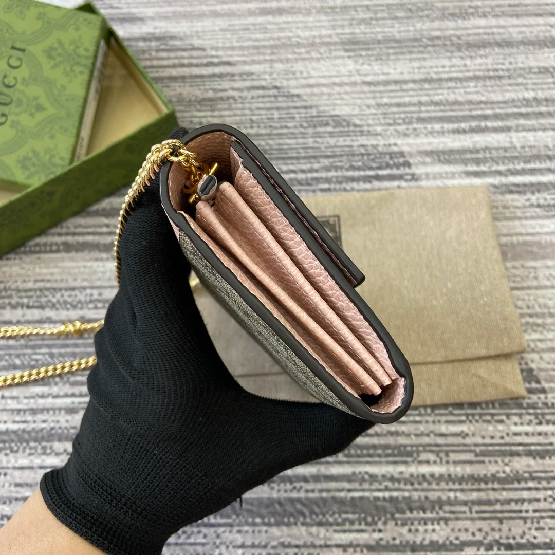 Gucci -【Comes with full boutique packaging】‼️ This sleek and slim wallet is crafted from classic double-G monogram canvas and pink smooth leather, featuring a beautiful chain strap adorned with mini double-G hardware, highlighting the distinctive charm of the GG Marmont collection.
