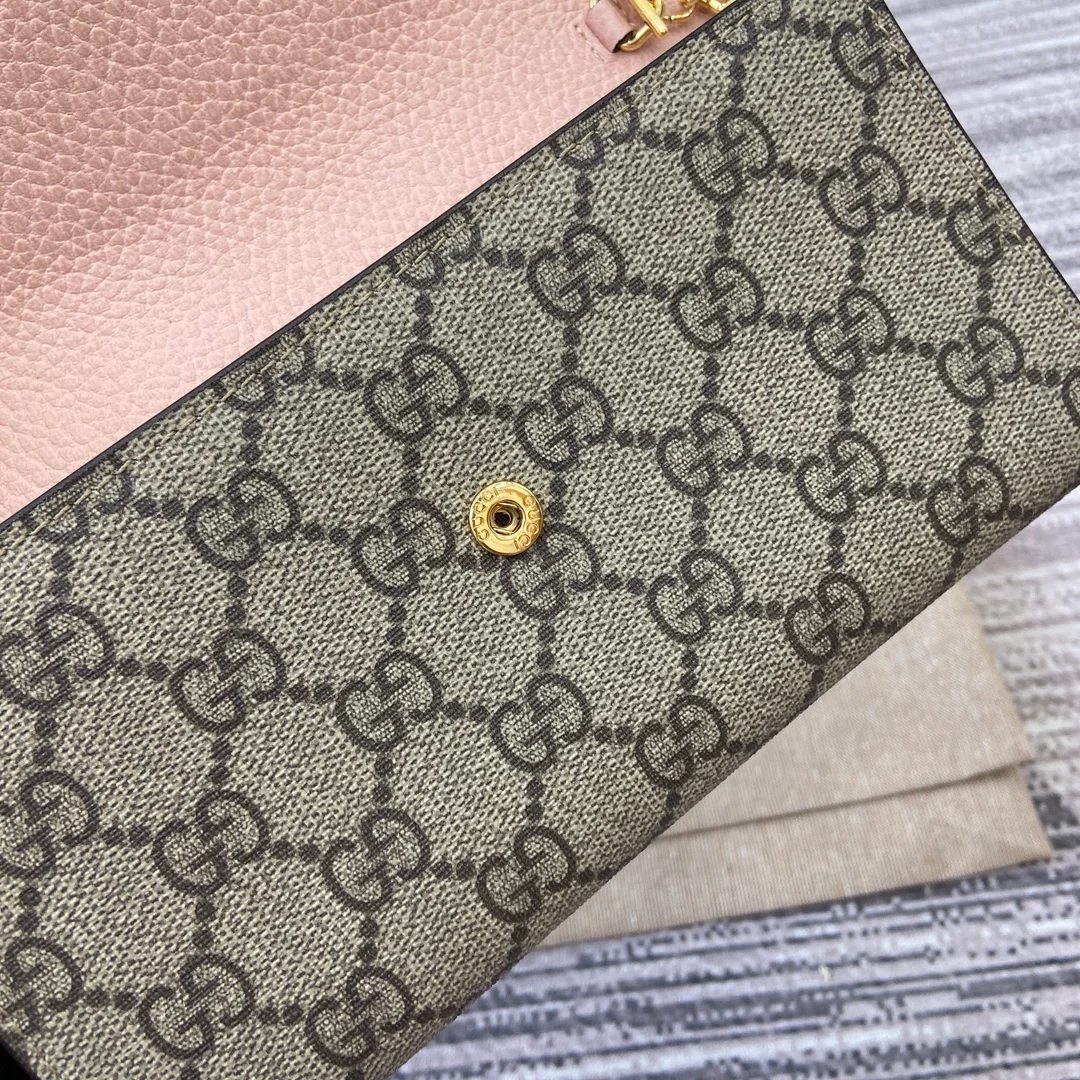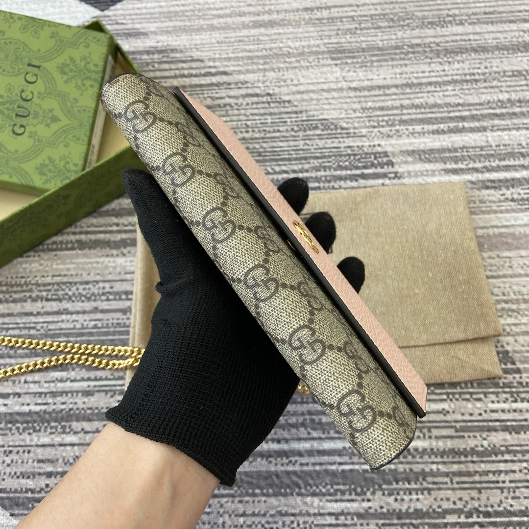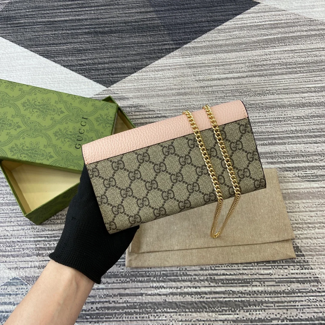 Gucci -【Comes with full boutique packaging】‼️ This sleek and slim wallet is crafted from classic double-G monogram canvas and pink smooth leather, featuring a beautiful chain strap adorned with mini double-G hardware, highlighting the distinctive charm of the GG Marmont collection.