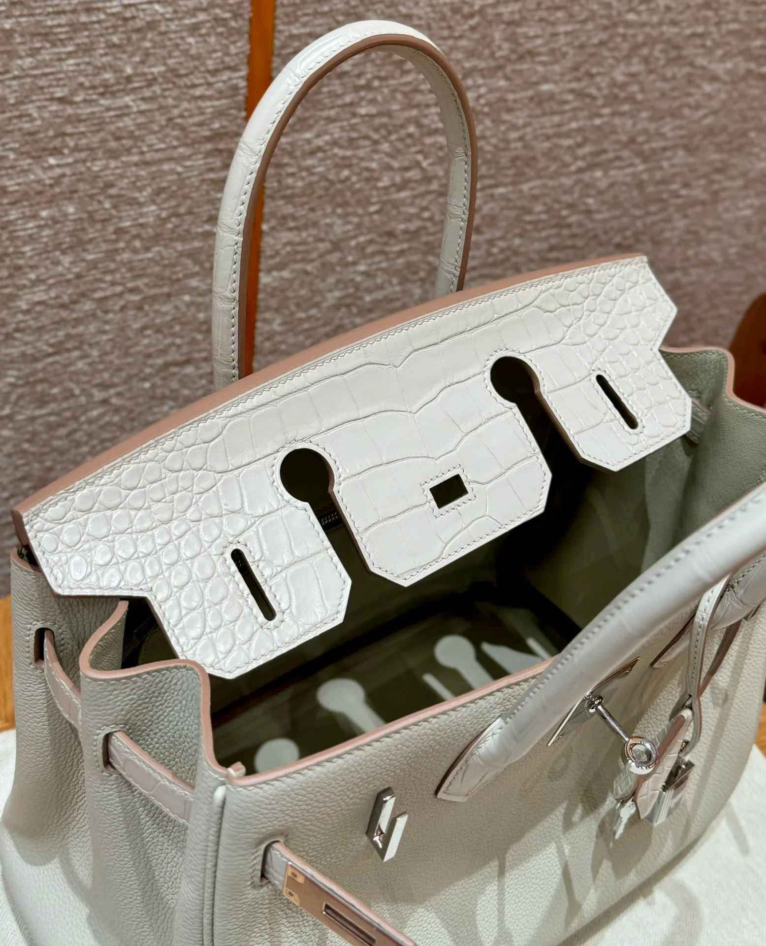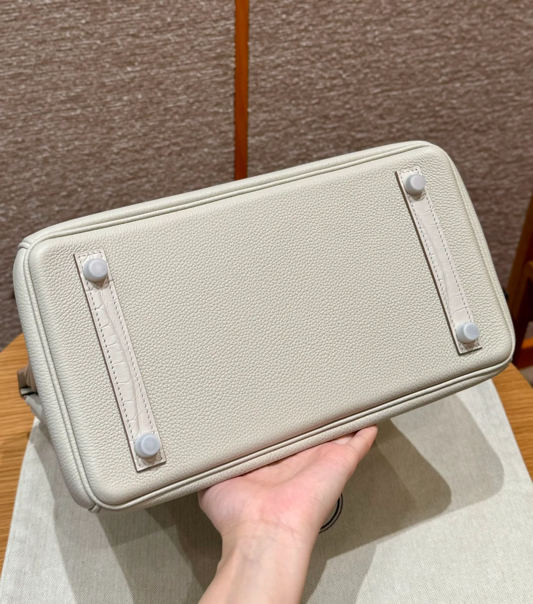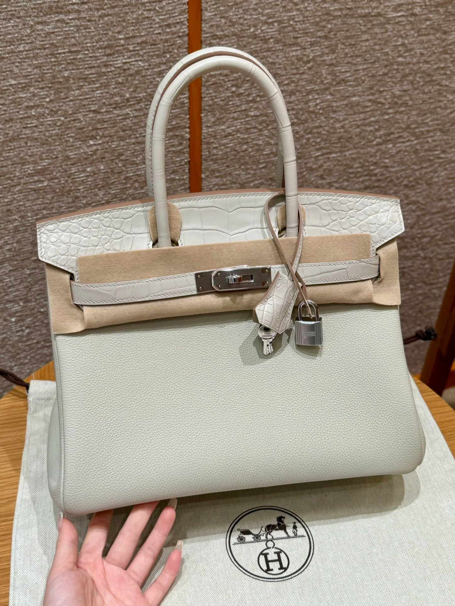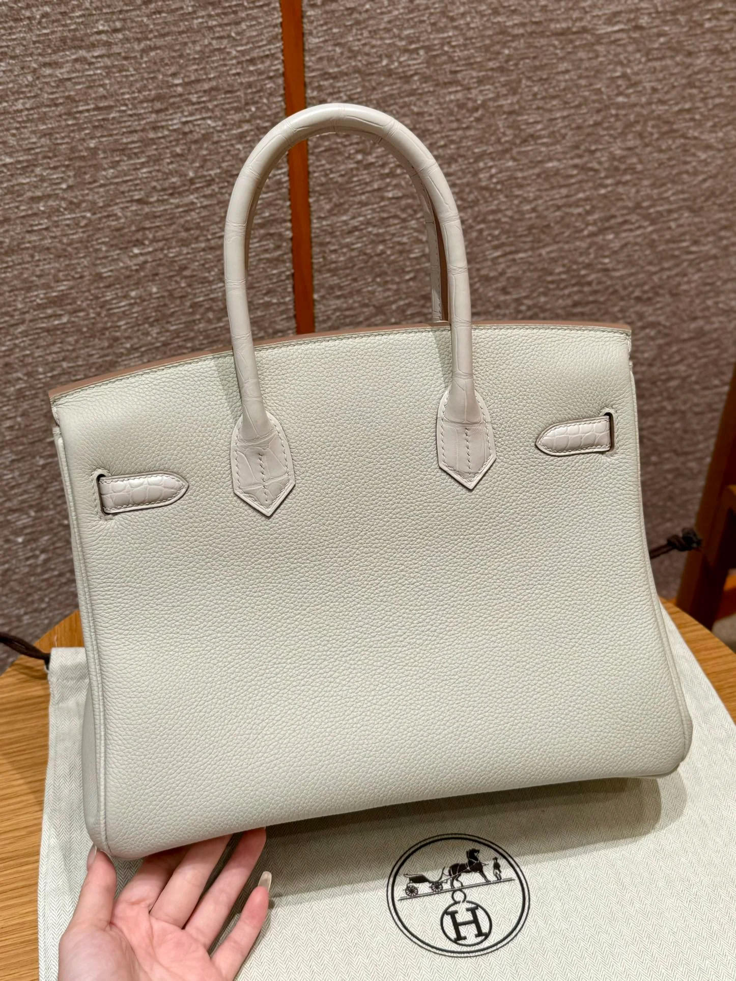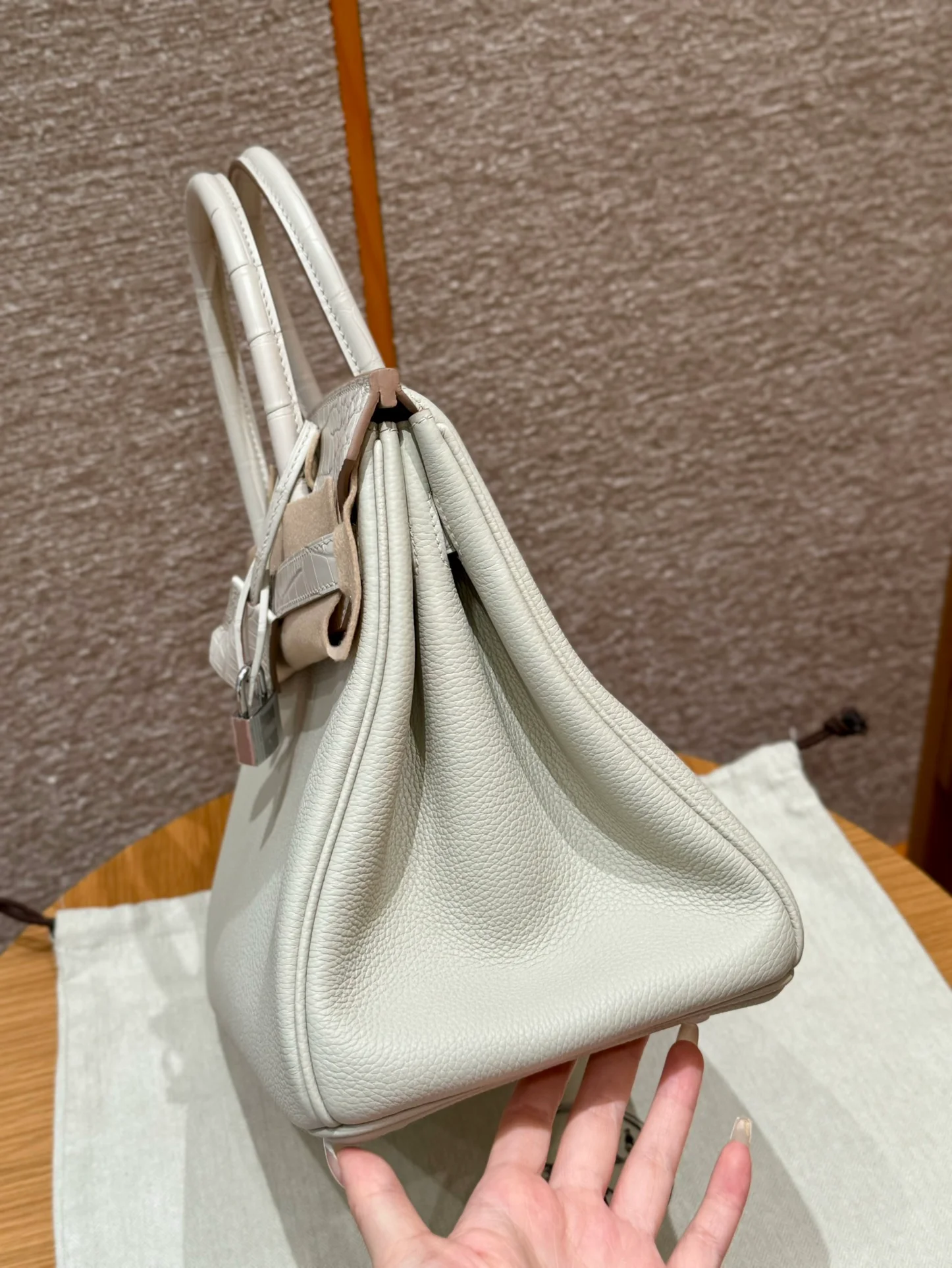 Hermes - Platinum Touch 30, Glacier White, Togo color scheme with matte American alligator 🐊 cap, silver hardware.