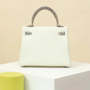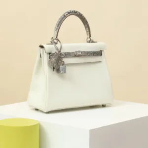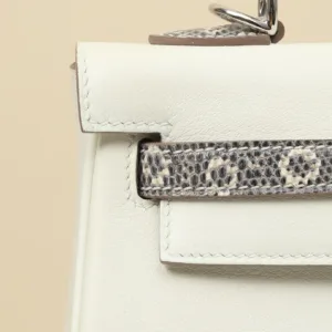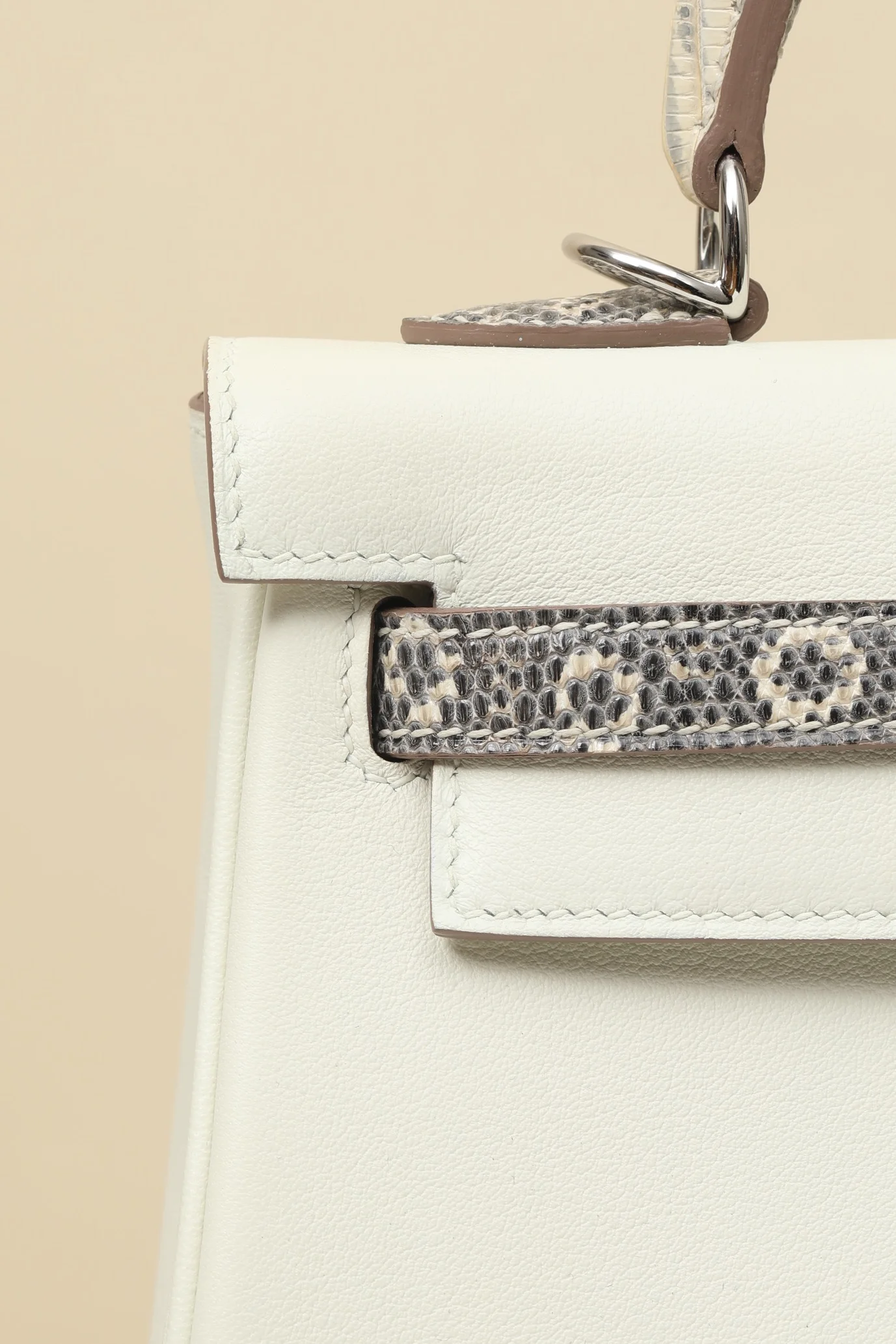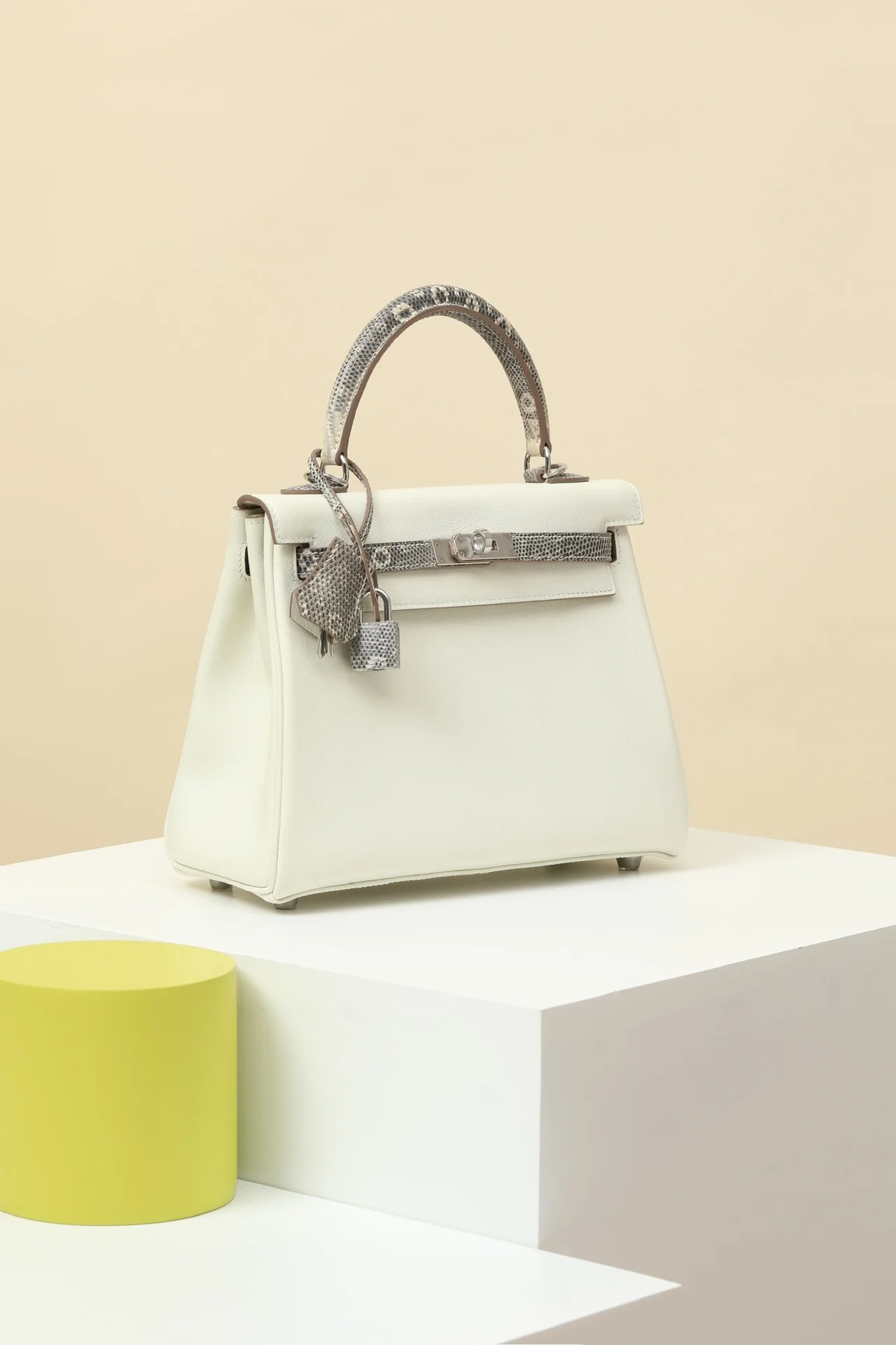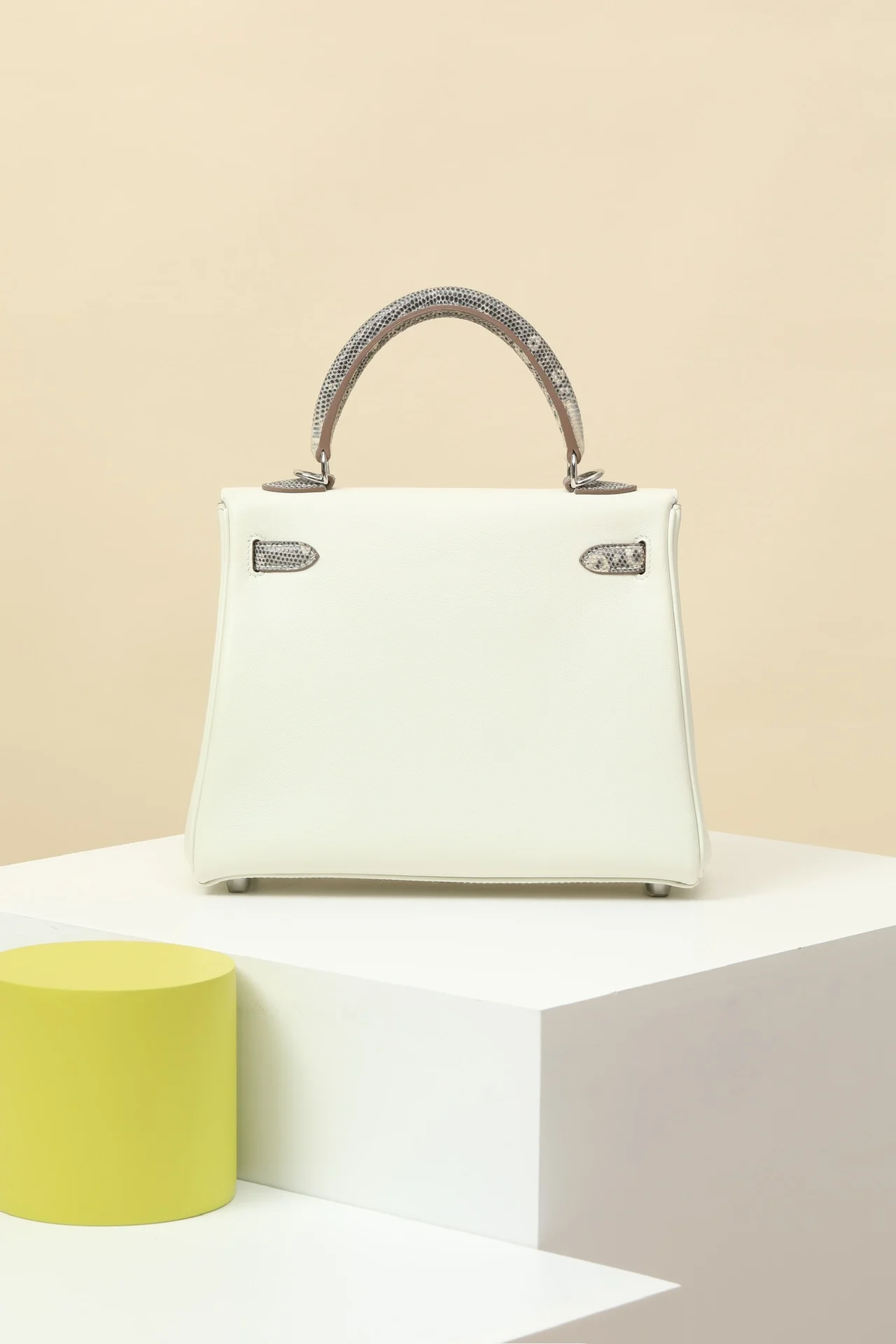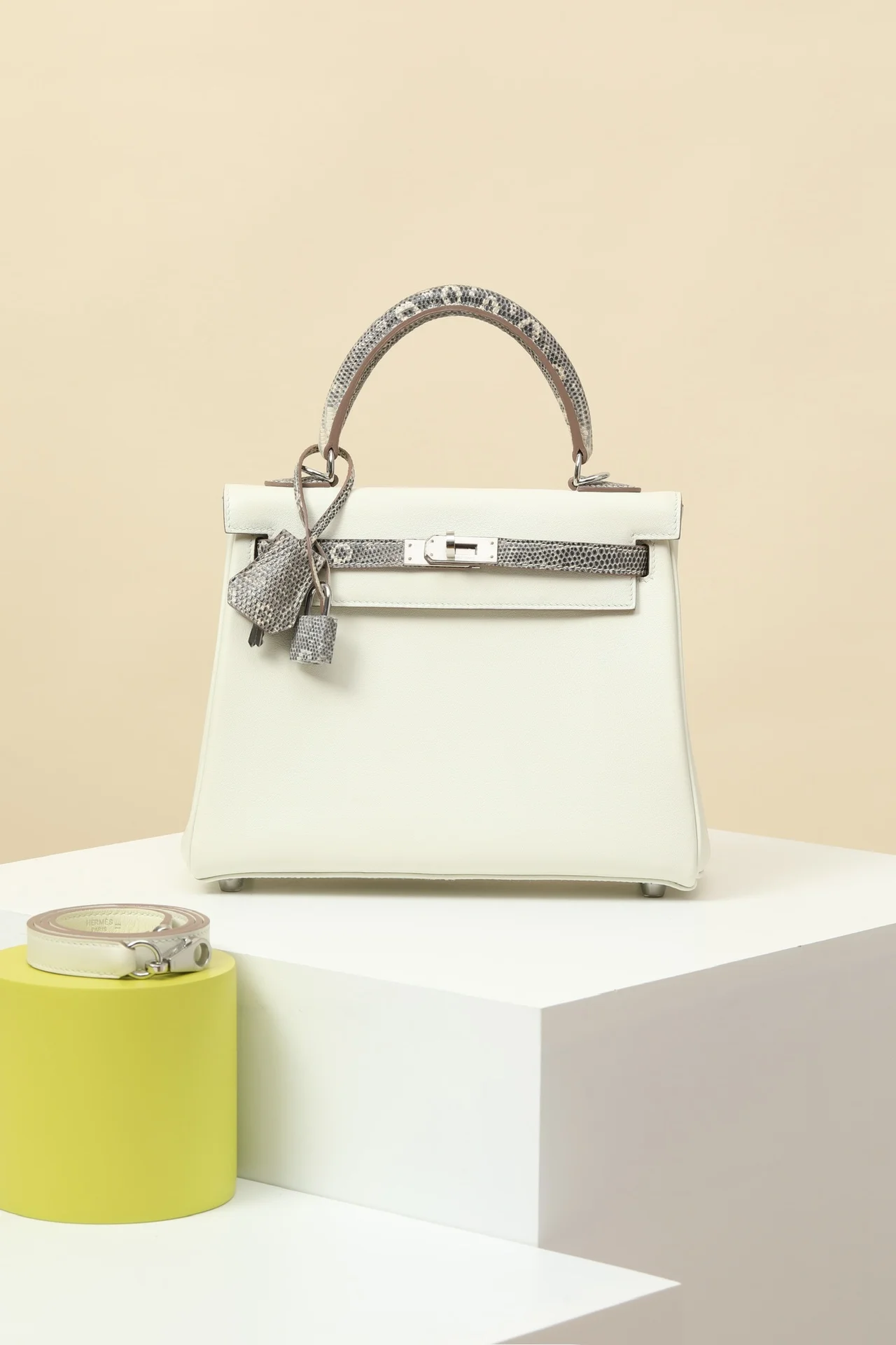 Hermes - Color: 0T Mushroom White / 1B Original Color Dimensions: Length 25cm * Depth 10cm * Width 20cm Shoulder Strap Length: Approx. 85cm Material: Swift Leather / Lizard Leather (with two straps) Kelly 25 Touch Handbag