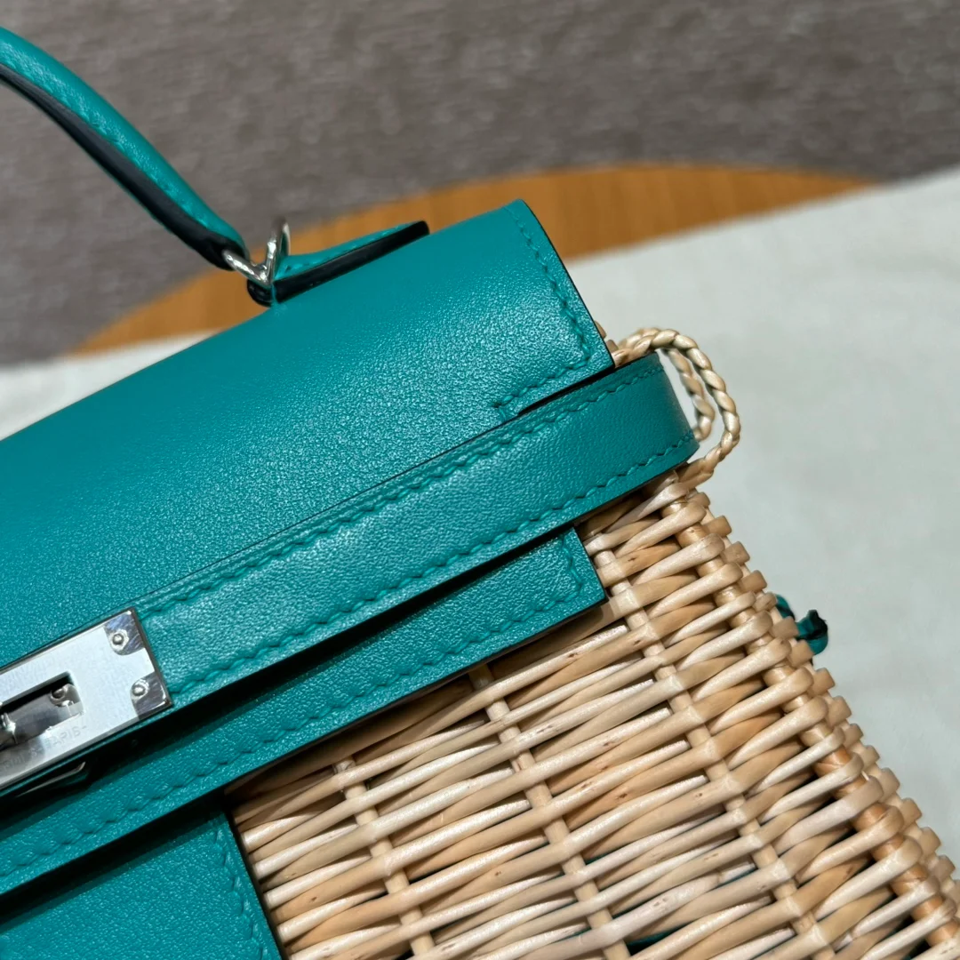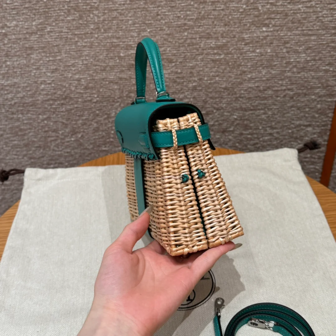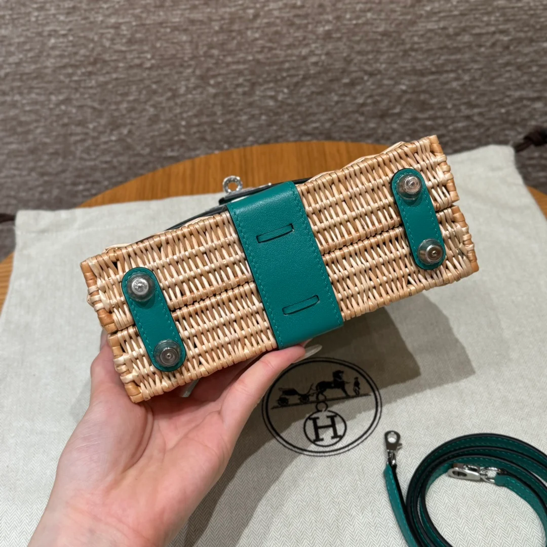 Hermes - Style: Kelly Picnic; Size: 20*18*12cm; Kelly Picnic Bag, Verona Green, French imported original plain cowhide leather, French imported bamboo woven frame, silver buckle, high-end fully handmade exclusive customization‼