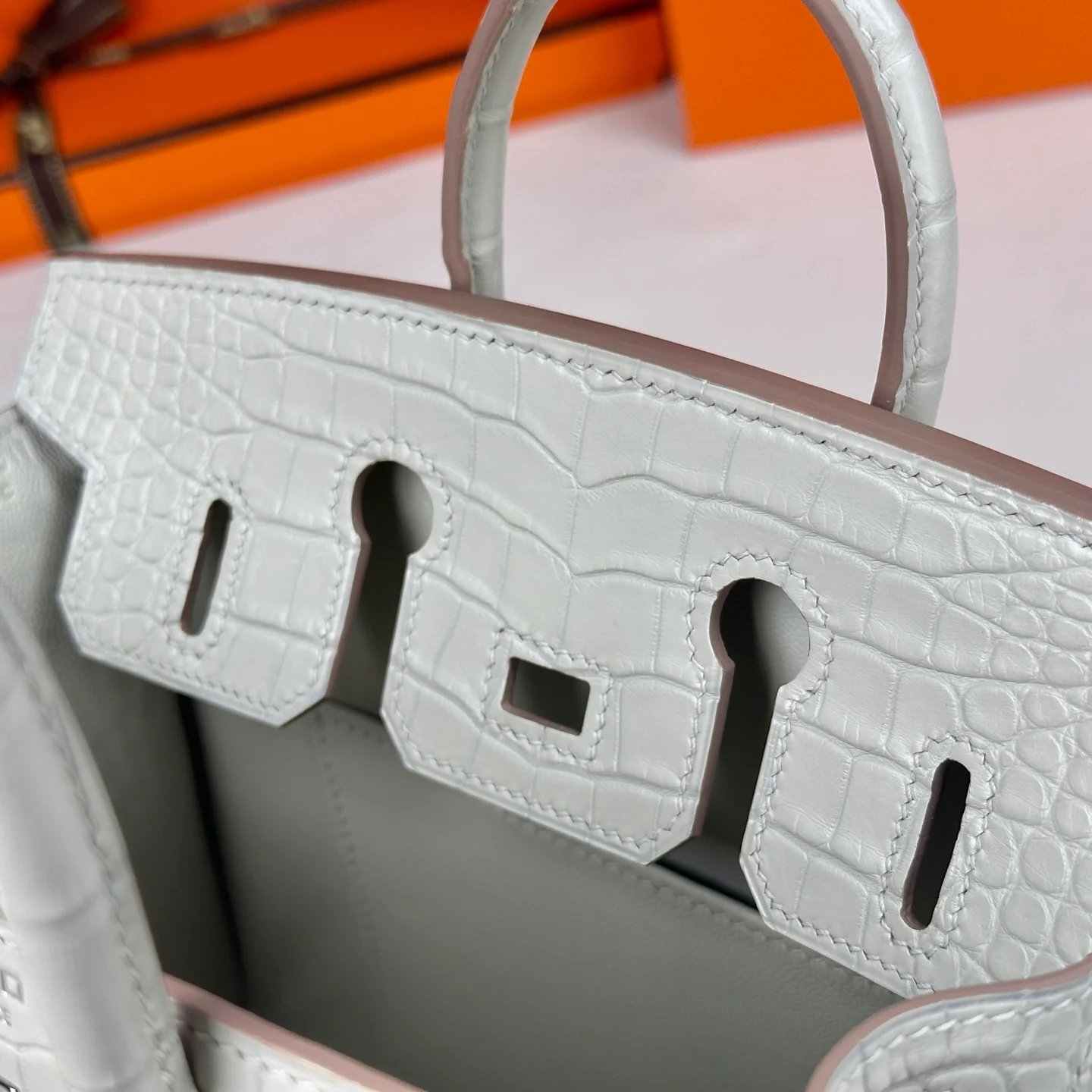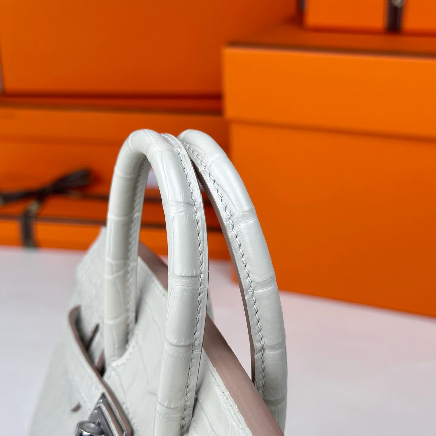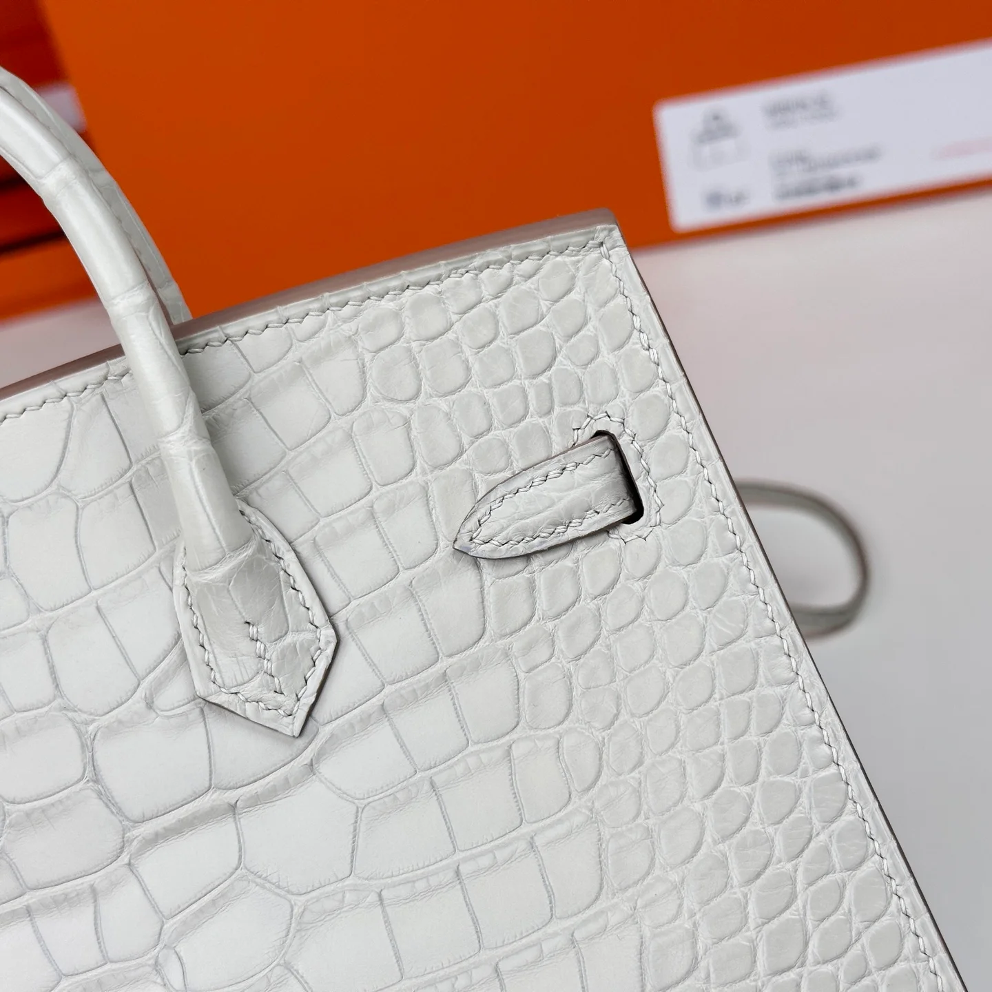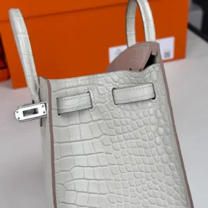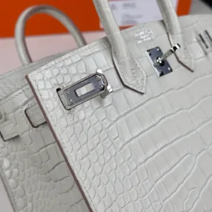 Hermes - Birkin 20 Glacier White Alligator Leather with Silver Buckle. The full, rounded grain indicates the genuine leather, and even the craftsmanship is clearly visible to the naked eye.