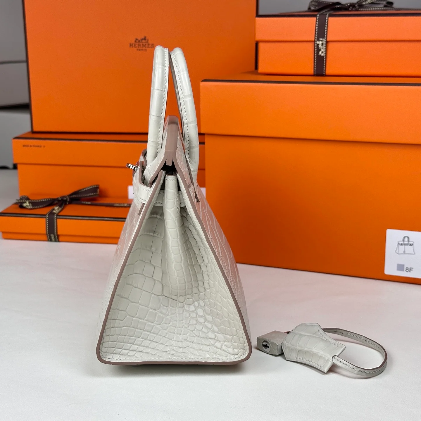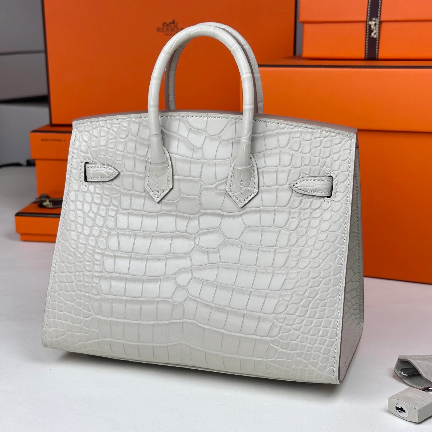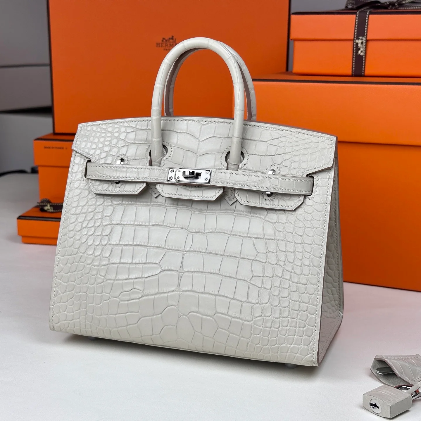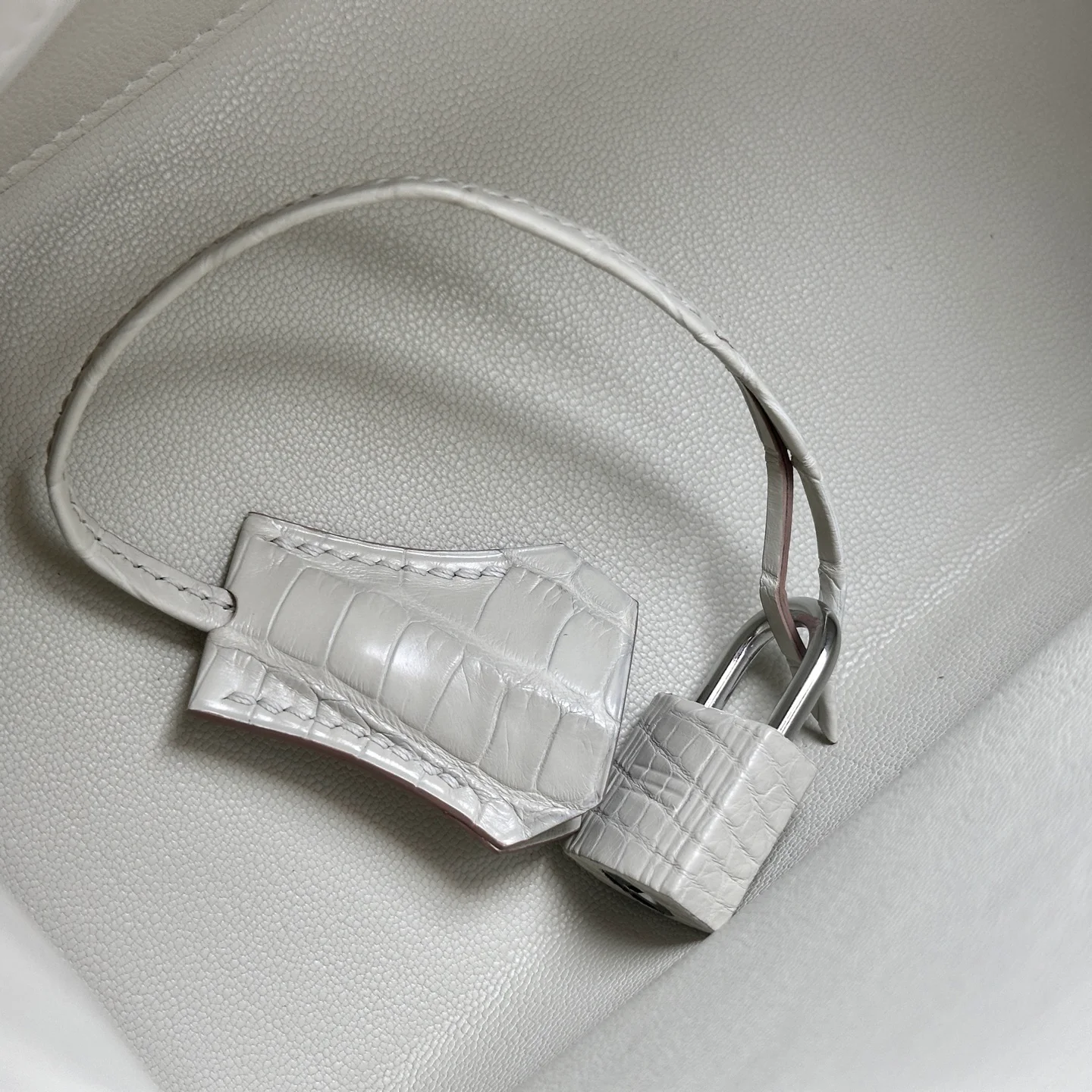 Hermes - Birkin 20 Glacier White Alligator Leather with Silver Buckle. The full, rounded grain indicates the genuine leather, and even the craftsmanship is clearly visible to the naked eye.