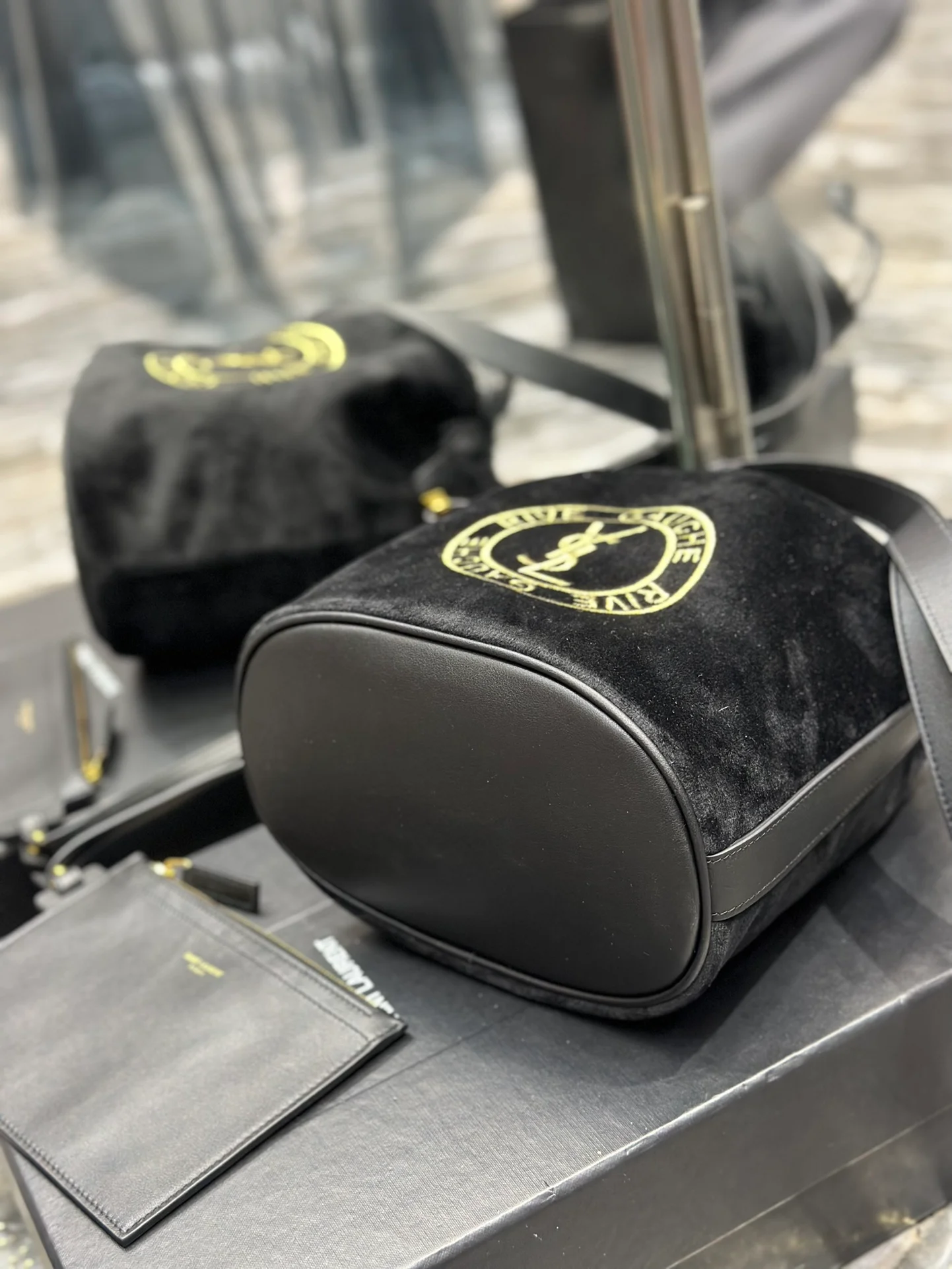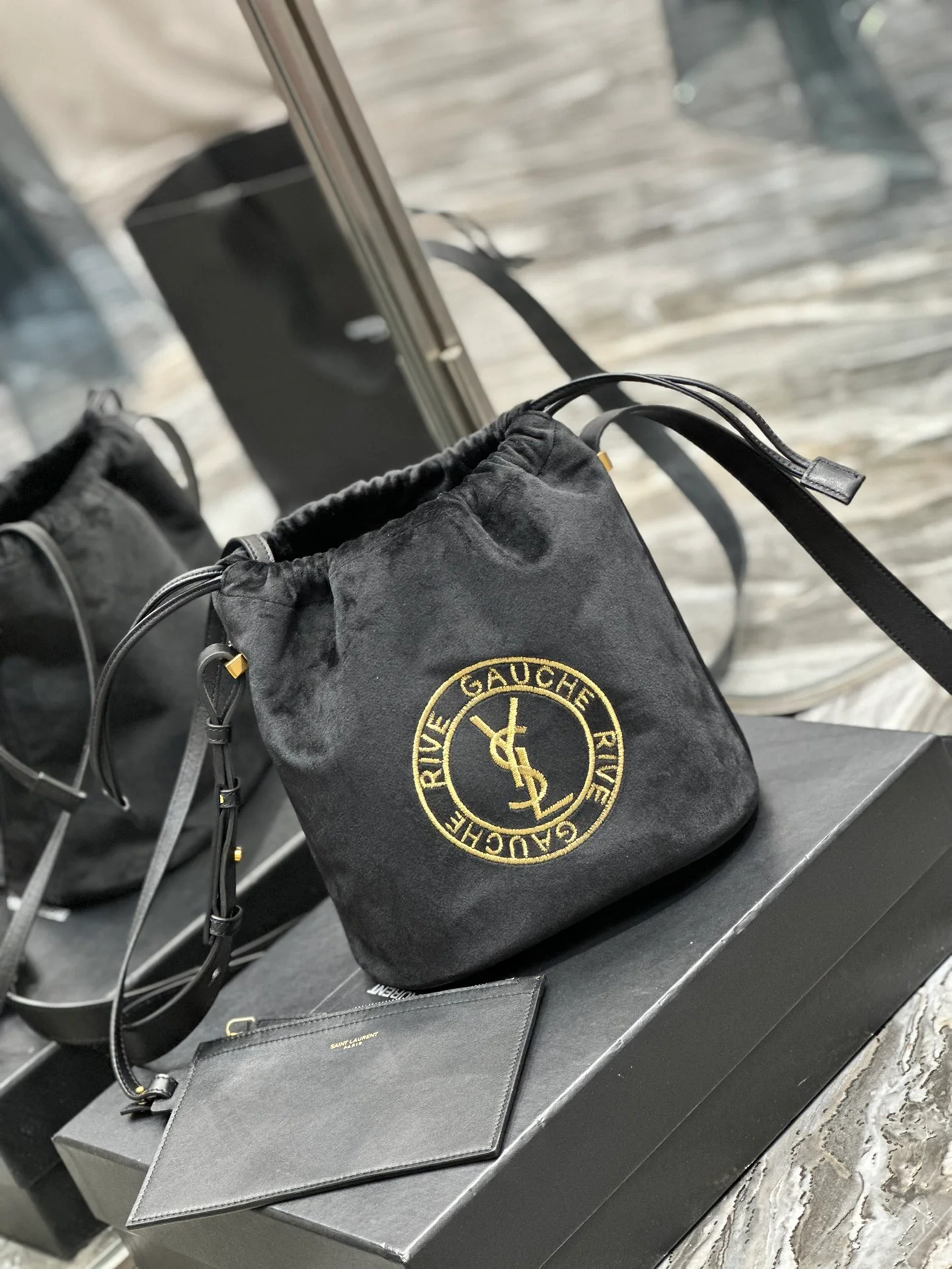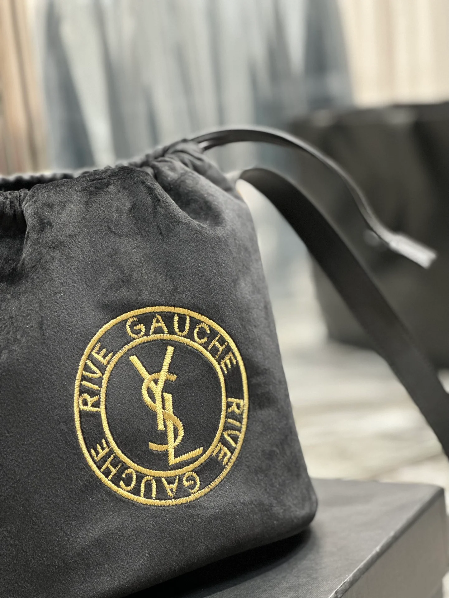 Yves Saint Laurent - <Black> 🖤RIVE GAUCHE New Embroidered Leather Drawstring Bucket Bag Dimensions: 21×23×14cm
